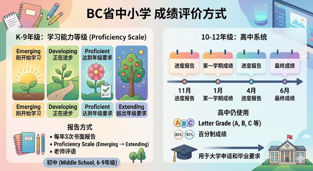 在 Victoria, BC(例如 Greater Victoria School District 61),学校成绩单的发布遵循 BC 省教育厅的新学生评估制度(Student Reporting Policy,2023年开始实施)。